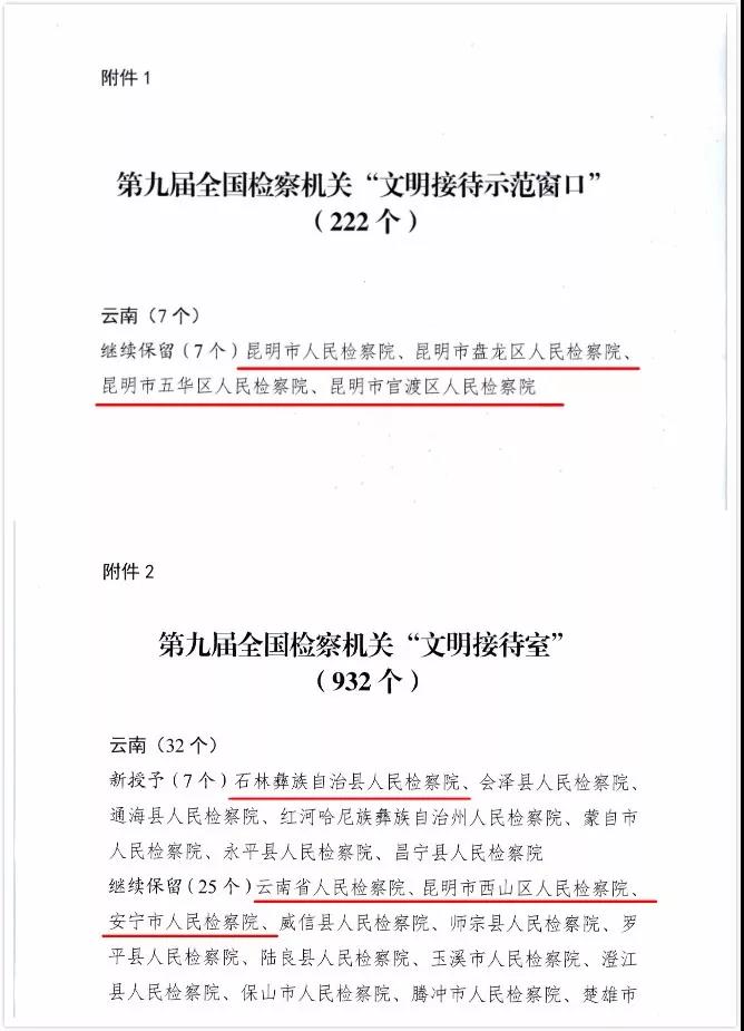 近日,最高人民检察院发文(高检发政字【2017】72号)表彰第九届全国检察机关“文明接待示范窗口”和“文明接待室”,昆明市检察院荣获全国检察机关“文明接待示范窗口”荣誉称号,这也是昆明市检察院第三次蝉联全国检察机关“文明接待示范窗口”荣誉称号。五华区检察院、盘龙区检察院、官渡区检察院在此次评比中保留了全国检察机关“文明接待示范窗口”荣誉称号,西山区检察院、安宁市检察院保留了全国检察机关“文明接待室”荣誉称号,新授予石林县检察院为全国检察机关“文明接待室”荣誉称号。截至第九届评比,云南省检察机关共有39个院获得表彰,昆明市检察机关就占7席,在全省占比17.95%。